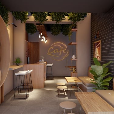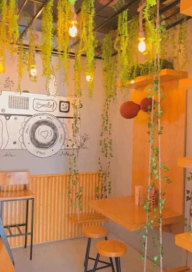 Vibrant Lighting: String lights and pendant fixtures cast a warm glow, enhancing the café's charm and making it ideal for evenings.